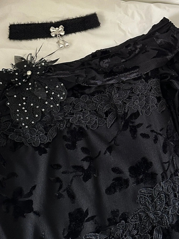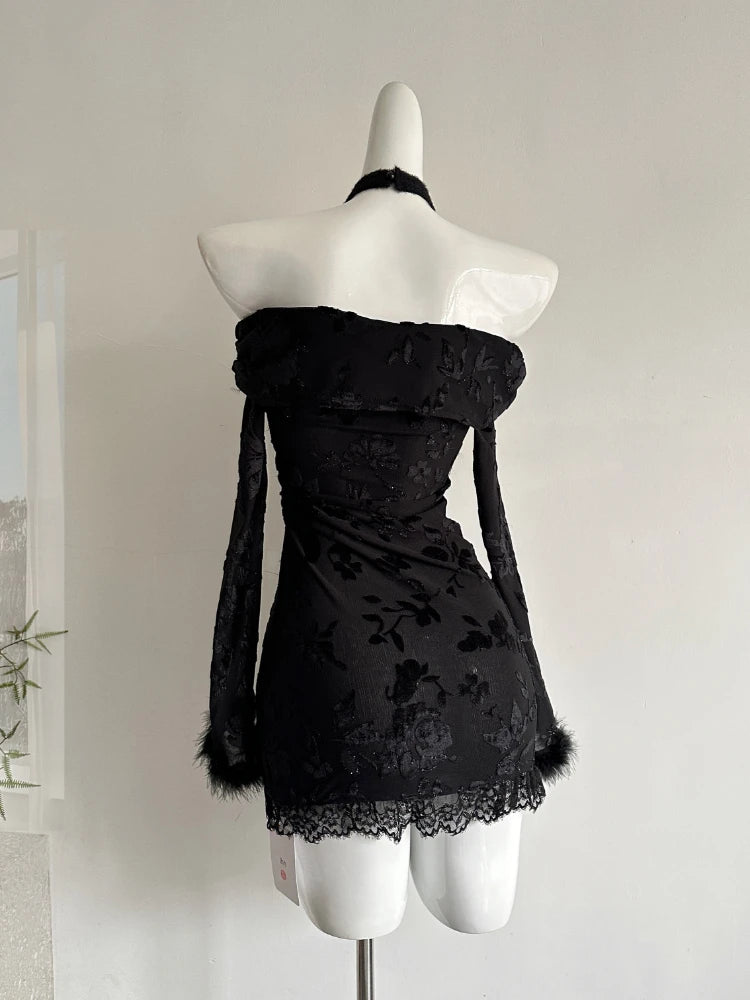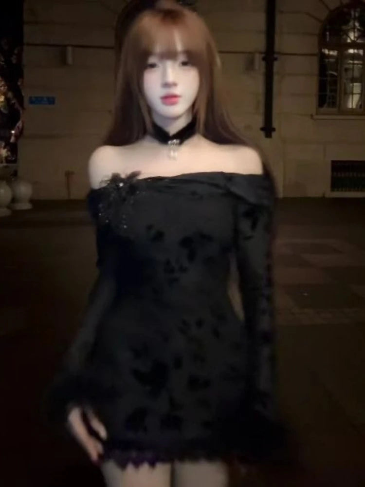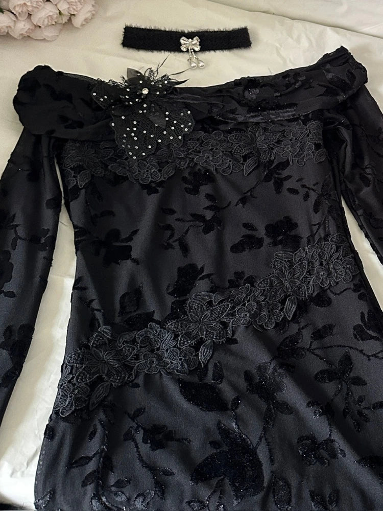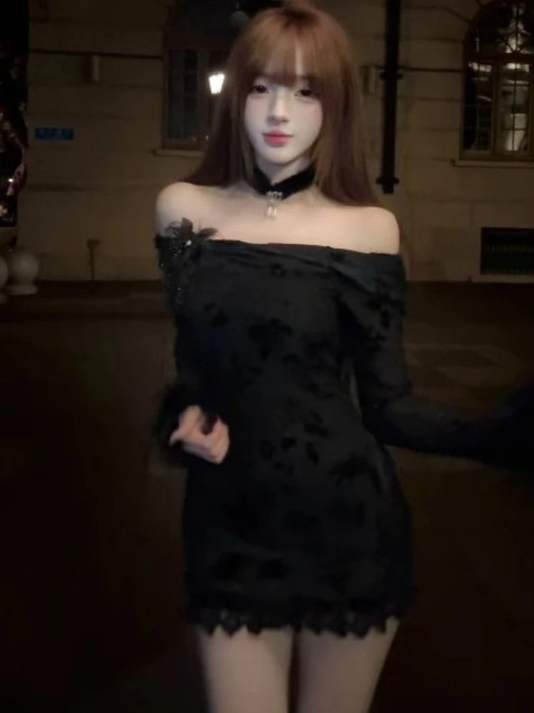 Dark Academia Gothic Black Lace Bodycon Dress Off Shoulder Long Sleeve Sexy Mini Dresses New Spicy Girl Party Y2k Clothing 2026