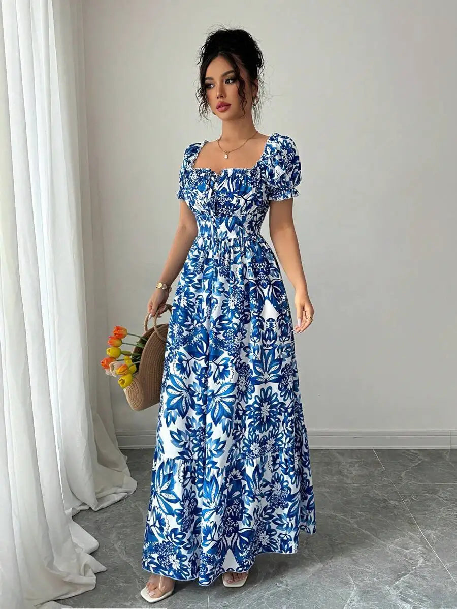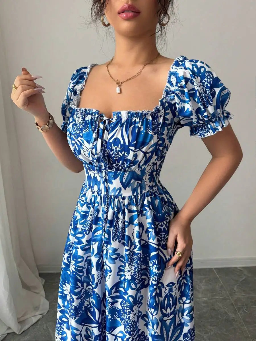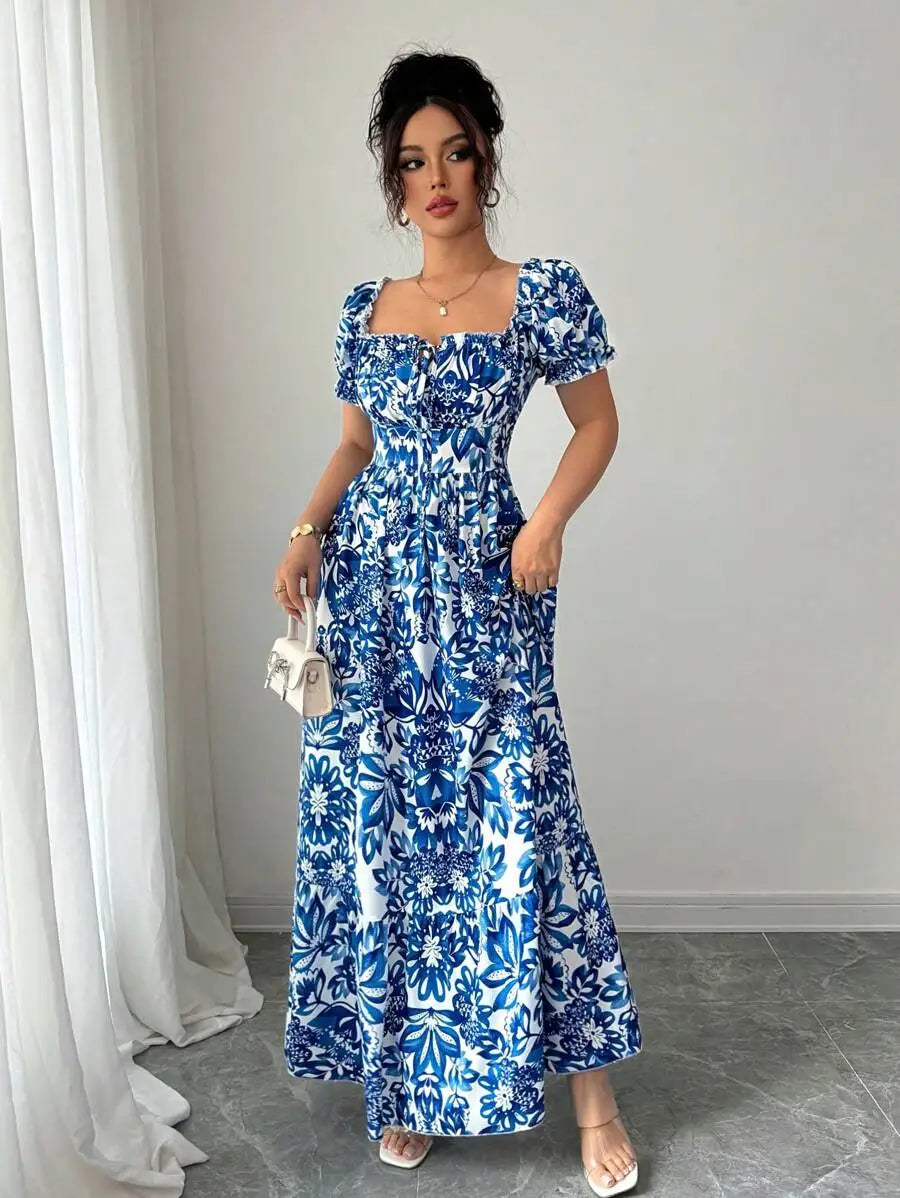 Elegant Women's Floral Print Bubble Sleeve Dress, Blue Long Dress, Front Tie Back Gathered Waist, Casual Vacation