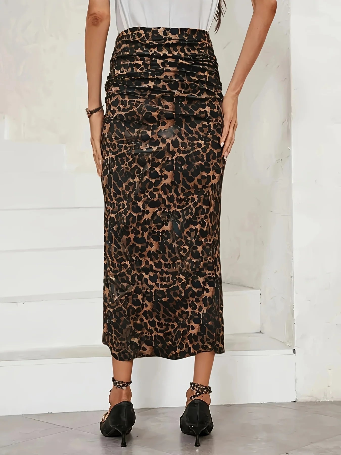 Plus Size Women's Brown Leopard Print Ruched Bodycon Maxi Skirt - Sexy Retro Style (0XL-4XL)